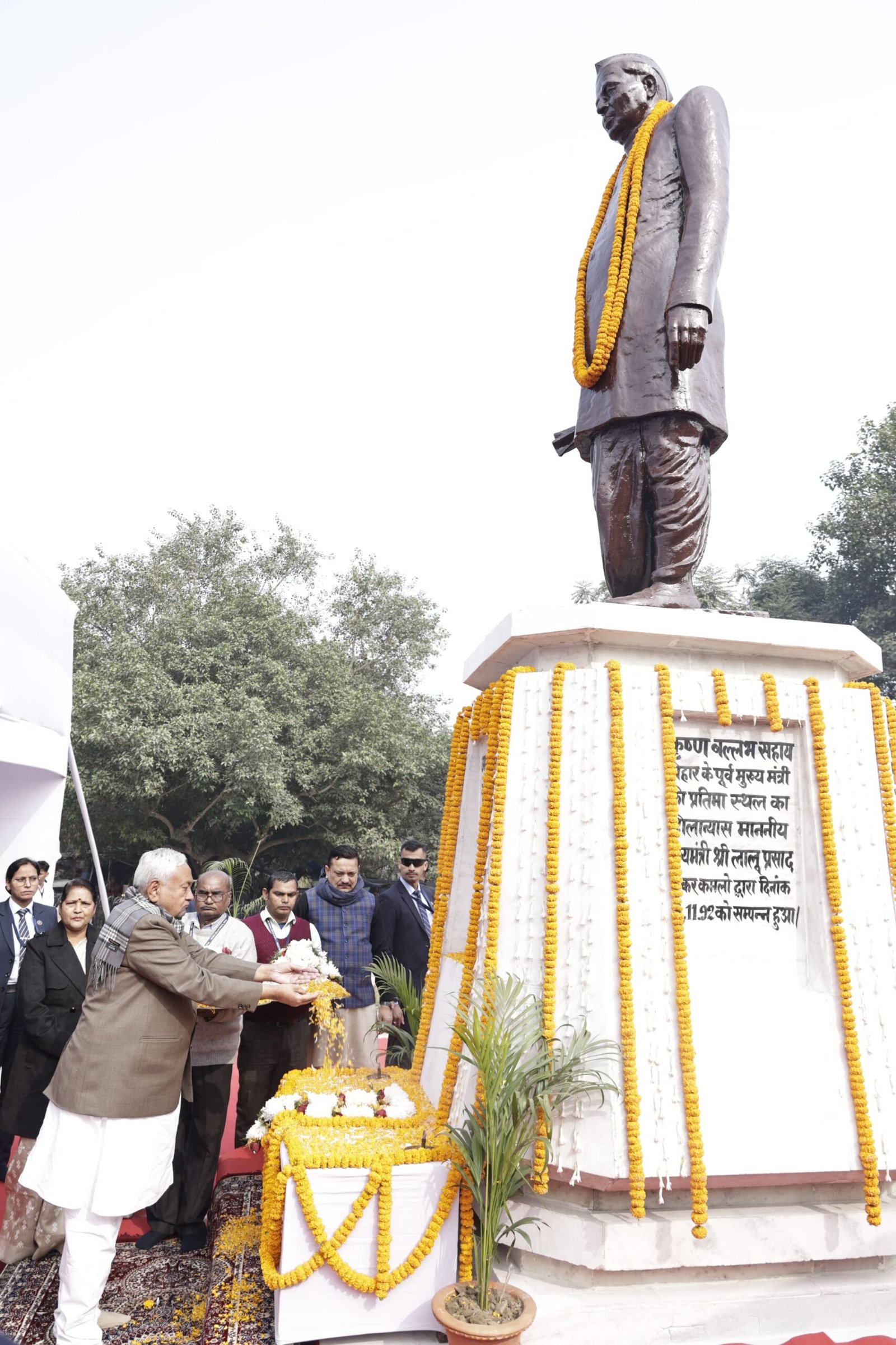 पटना : पूर्व मुख्यमंत्री स्व० कृष्ण बल्लभ सहाय जी की जयंती आज पूरे राज्य में मनायी गयी। स्व० कृष्ण बल्लभ सहाय जी के जन्मदिवस पर राजकीय जयंती समारोह का आयोजन नया सचिवालय, पटना के दक्षिण पेसु के कोने (तीन मुहानी) पर स्थित प्रतिमा स्थल पर किया गया। मुख्यमंत्री नीतीश कुमार ने स्व० कृष्ण बल्लभ सहाय जी की प्रतिमा पर माल्यार्पण कर उन्हें भावभीनी श्रद्धांजलि अर्पित की।