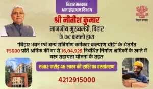 पटना : मुख्यमंत्री नीतीश कुमार ने आज 1, अणे मार्ग स्थित ‘संकल्प’ से वीडियो कॉन्फ्रेंसिंग के माध्यम से रिमोट द्वारा बिहार भवन एवं अन्य सन्निर्माण कर्मकार कल्याण बोर्ड के तहत 16 लाख 04 हजार 929 निबंधित निर्माण श्रमिकों के खाते में वार्षिक वस्त्र सहायता योजना अंतर्गत उत्क्रमित सहायता राशि 5000 रुपये प्रति निर्माण श्रमिक की दर से 802 करोड़ 46 लाख 45 हजार रुपये की राशि का अंतरण किया। साथ ही ‘मुख्यमंत्री प्रतिज्ञा योजना’ के वेब पोर्टल का मुख्यमंत्री ने शुभारंभ किया।